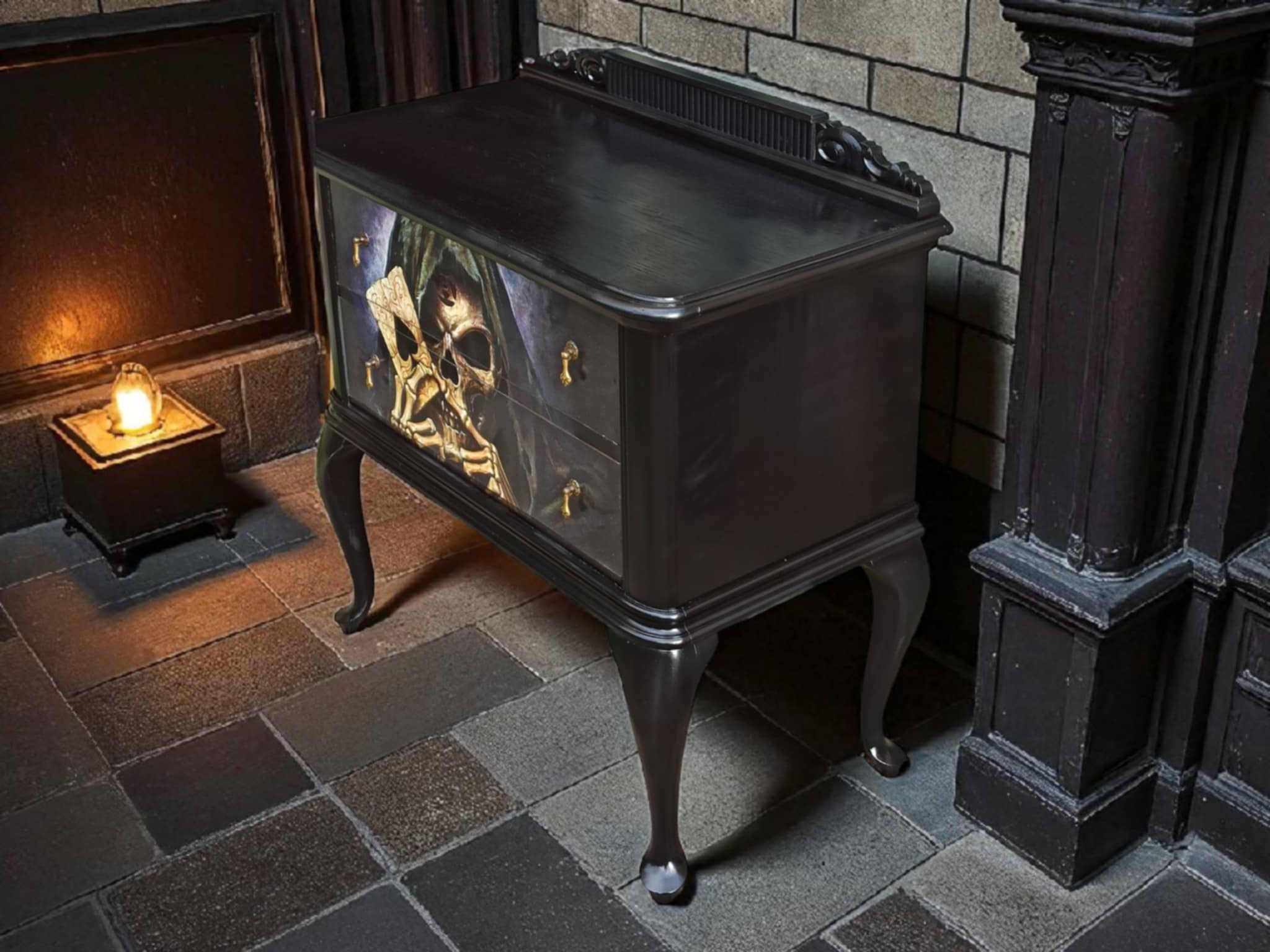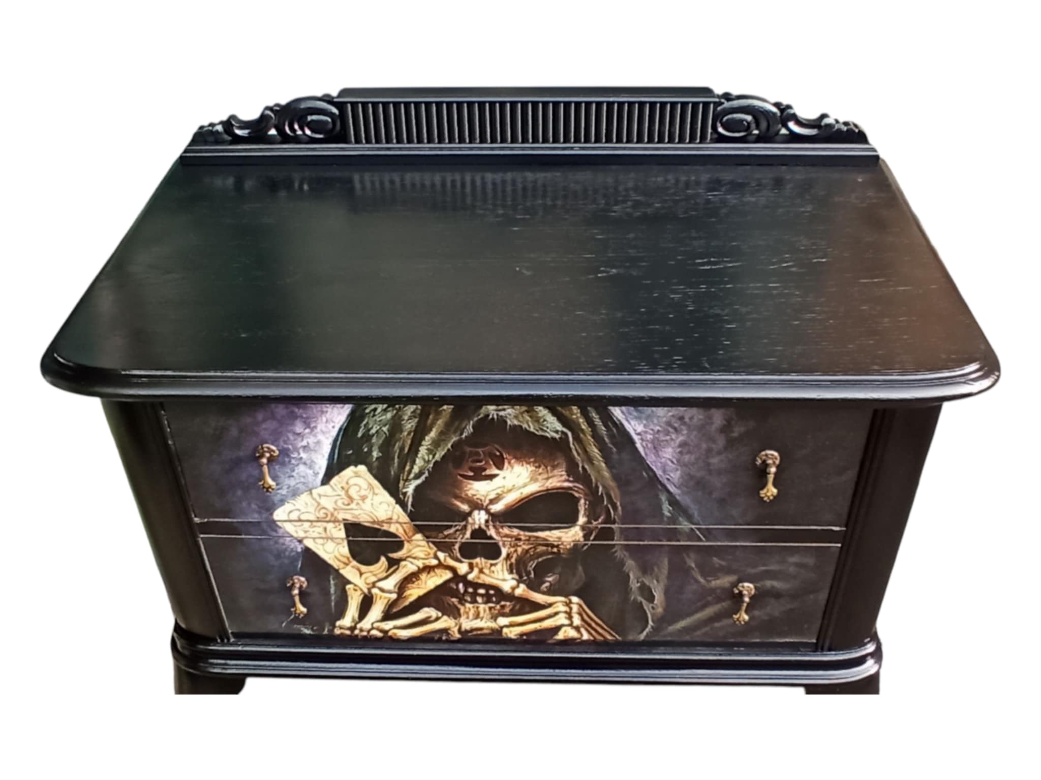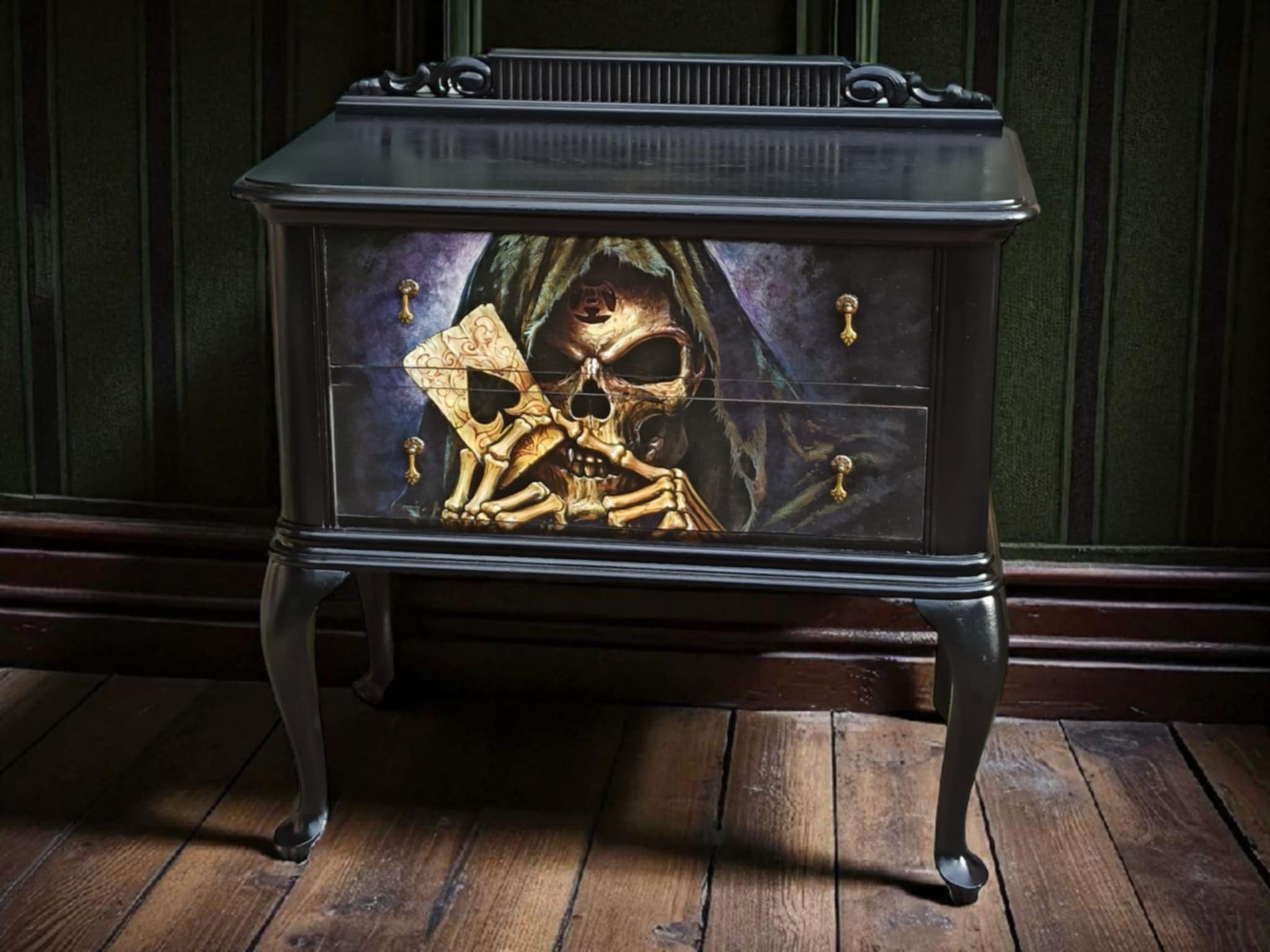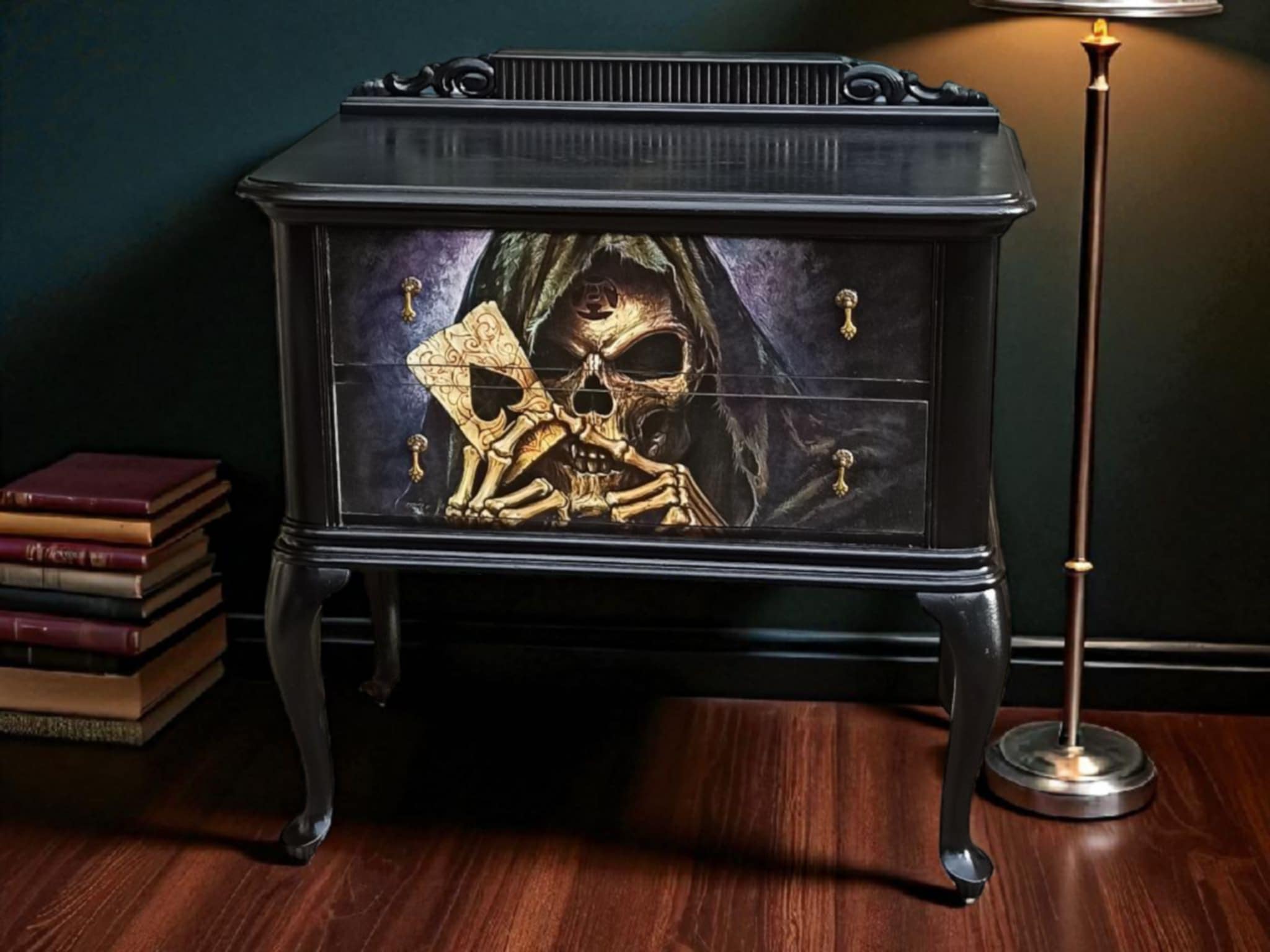 Diese stilvolle, von Hand aufgearbeitete Kommode ist weit mehr als nur ein Möbelstück – sie ist ein Statement. „Erik“ verbindet klassisches Design mit einem düsteren, ausdrucksstarken Motiv: Ein kunstvoll gestalteter Totenschädel in dunklen Farbtönen, der Spielkarten in den Händen hält.