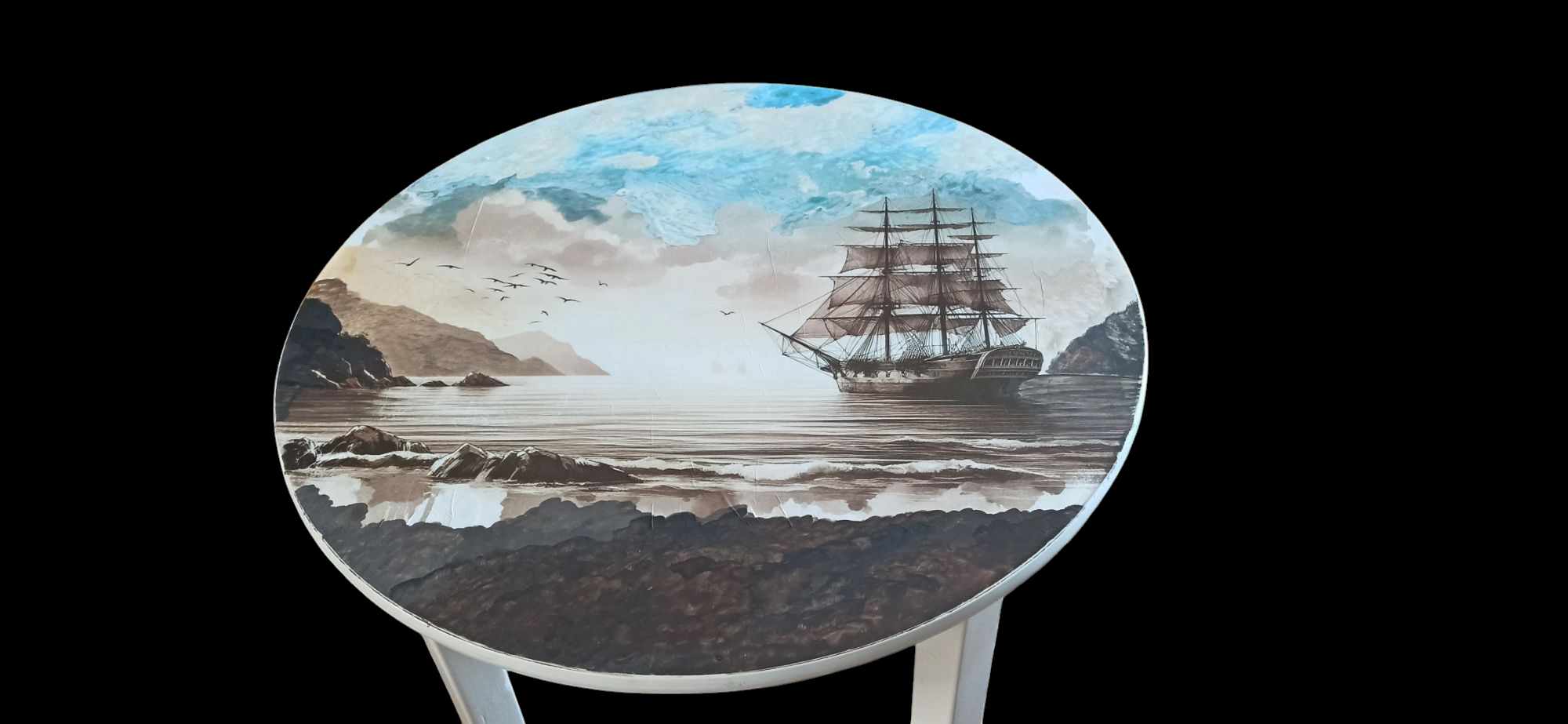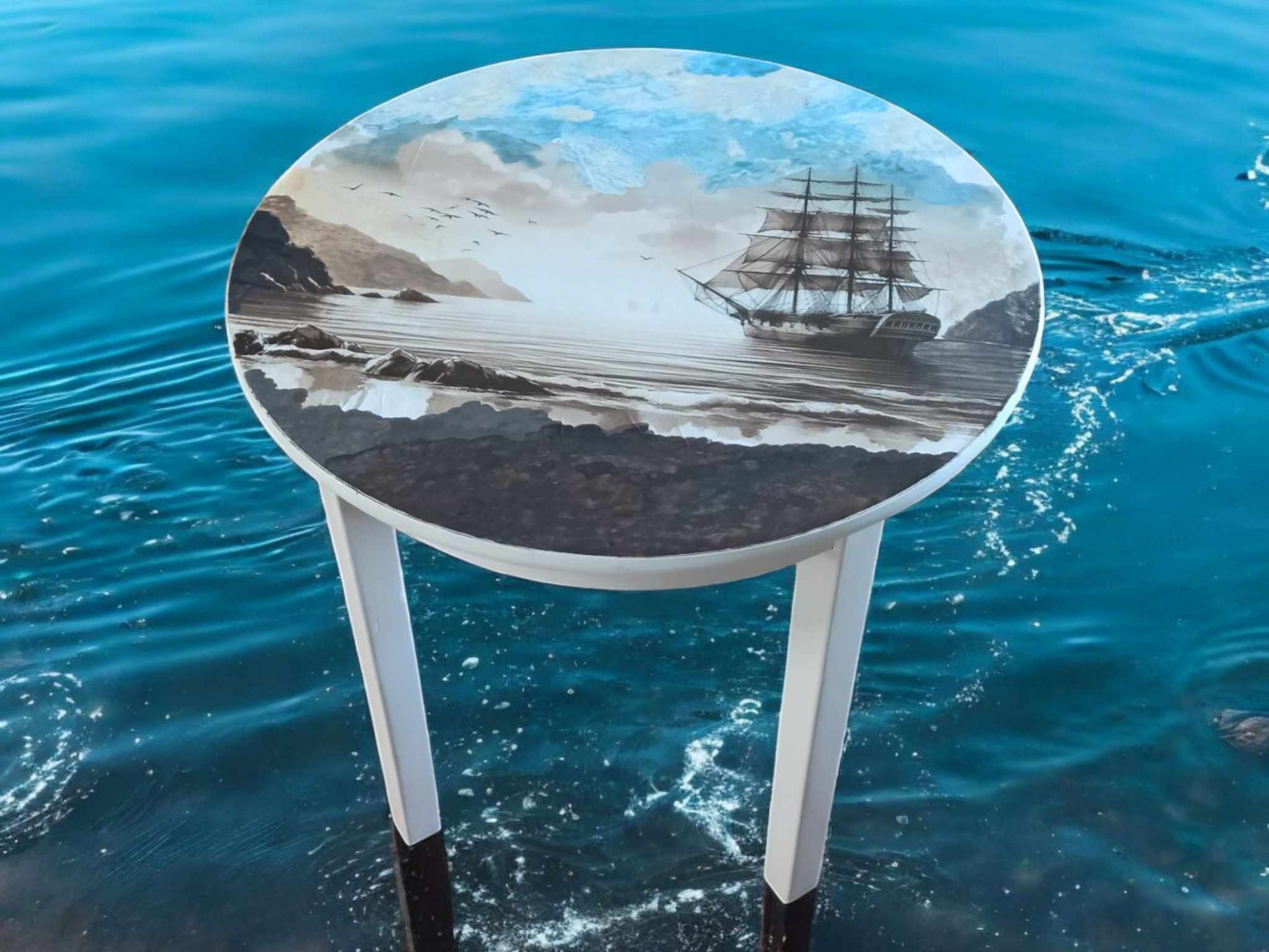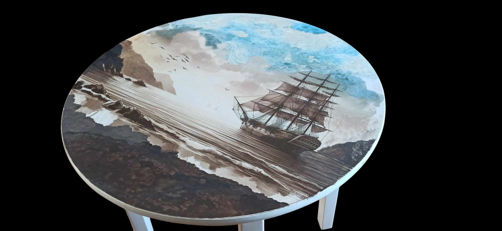Nach den Vorarbeiten haben wir Anno erst mal die Beine in weiß lackiert, dann kam das Motiv. Hier mußte ich selber noch einiges dazu malen, das Motiv reichte leider nicht über den ganzen Tisch. Aber es hat sich gelohnt. Zum Schloss haben wir es mit Epoxidharz versiegelt.