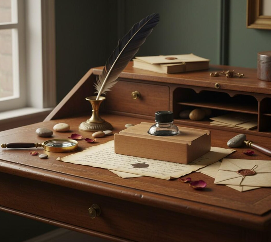 Vintage Tintenfass im Holzblock – Klassisches Schreibzubehör